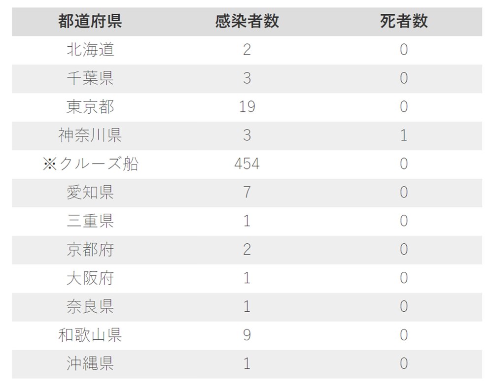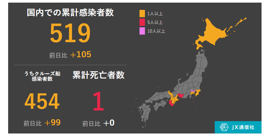 除了即時更新感染數據之外,也會反映在地圖上,目前可以看到集中東京、大阪、和歌山及名古屋。而當然數字上最多的還是郵輪「鑽石公主號」,目前可以看到有454人受感染,也有提供跟前一天的差異,方便大家一眼可以了解進展。