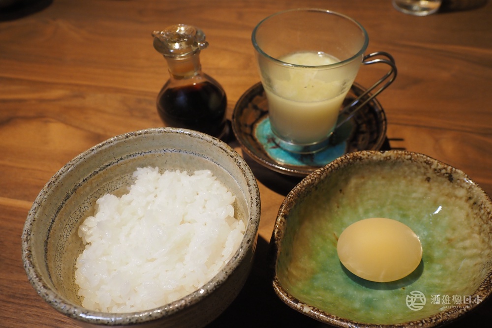 其他像是韃靼、雞皮涼拌、生雞火腿都令人印象深刻,回味無窮。會出三道烤的,生的都那麼好吃,烤的簡直好吃到要升天了。最後食事為TKG搭配雞白湯,蛋選用無殼蛋(用醋酸把彈殼融掉),還蠻有趣的。