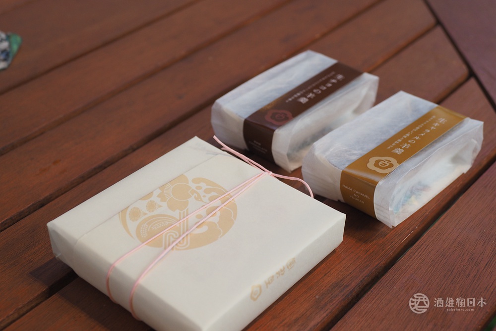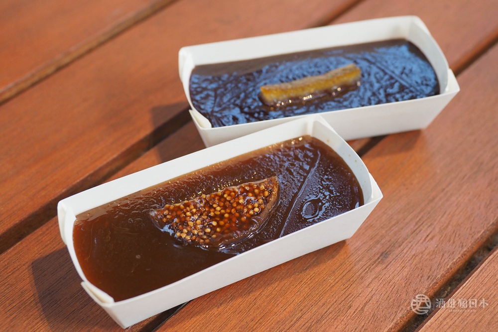 百花園最受矚目的產品,就是生牛奶糖羊羹(前)、以及生巧克力羊羹(後)。生牛奶糖羊羹使用佐渡奶油製作生牛奶糖,再跟白豆沙餡混和成羊羹,上面點綴著無花果乾。
