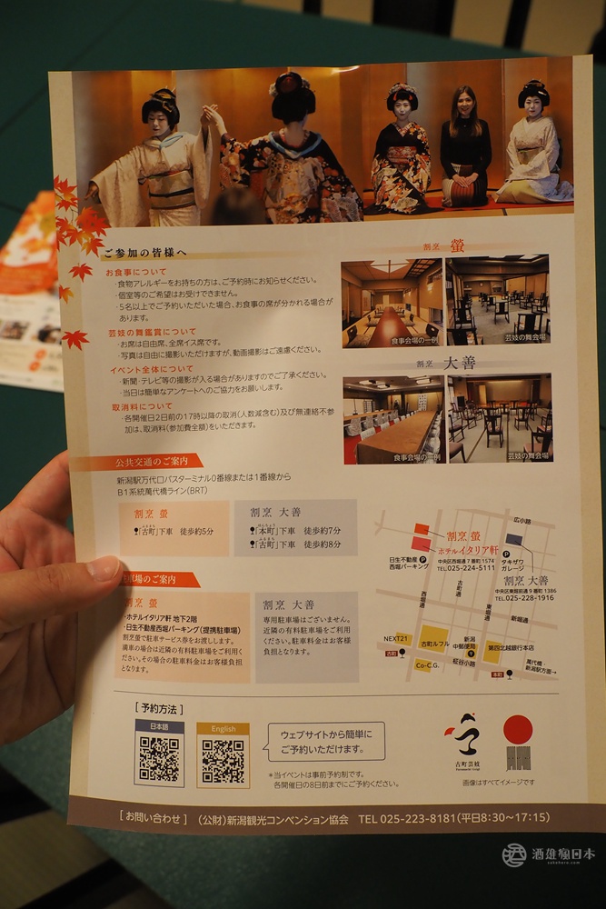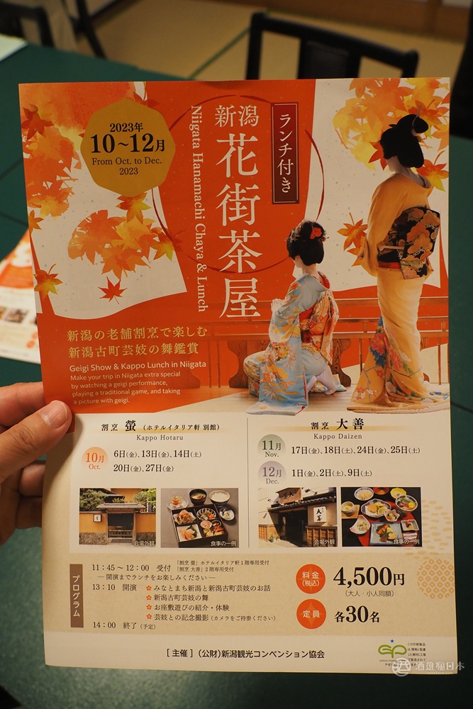 最後想跟大家分享由新潟觀光協會主辦,柳都藝妓在今年秋冬的活動,可以在指定料亭,享用和食料理之後,再看藝妓表演拿手的舞技,也會跟觀眾介紹座敷遊戲,最後還可以跟他們合影留念。詳細請參照DM上所示的日期跟地點,有興趣的話可以從網頁預約。
