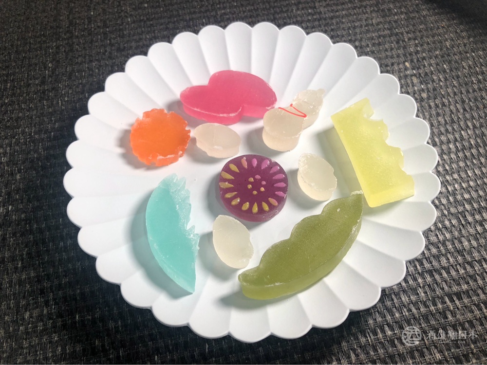 更新的代表性產品舊式前陣子很流行的琥珀糖,取名為にいがた琥珀,每種圖案的口味都不同。万代橋是柚子、毛豆為抹茶、雪是杏桃、佐渡是草苺、波浪是薄荷・花火為藍莓、酒跟米使用今代司酒造的日本酒製成。非常別出心裁。