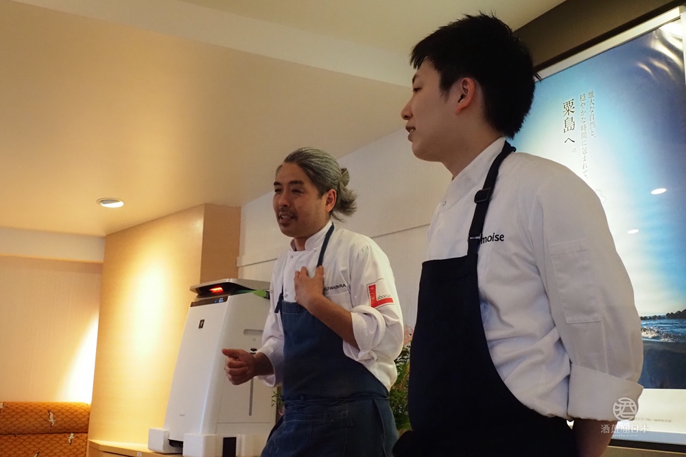 聽完船上活動簡報之後,提供船上餐點的兩位主廚就登場了,分別是義大利餐廳 サントピアット的桑原宗紀主廚(加茂市),以及法國料理餐廳 Restaurant L’armoise 的田中良太郎主廚。