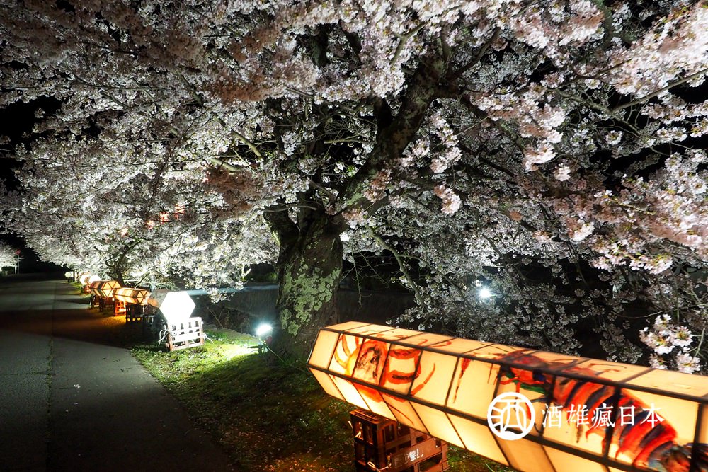 吃飽後我們重回真野公園,來欣賞櫻花的夜間點燈,燈籠據說是以前用於農業的,拿來作文化傳承,而上面的畫都是在地中小學生所繪製,非常可愛