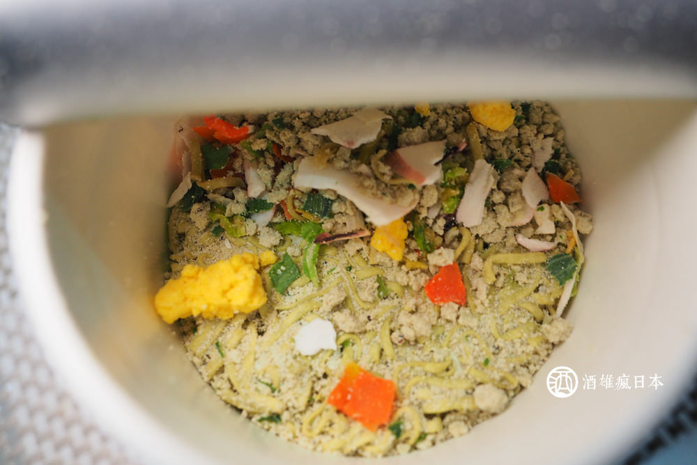 OPEN~~~連麵也是綠色的耶!料有蛋、烏賊、蔬菜等等。方法超簡單,打開蓋子之後,加入熱水,靜待三分鐘就可以食用!