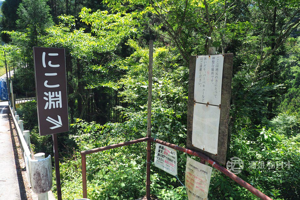 再往前大約15分鐘,就可以抵達「にこ淵」的停車場,這一段路雖然是蜿蜒的山路,但路寬還算寬,不至於很難開,就算自駕初學者也可以安心前往。從停車場走到「にこ淵」(有點從路面走下山谷的感覺),大約有10分鐘左右的路程,但因為是石頭堆成的階梯,且段差很大,所以不是很好走,要來的朋友,千萬要記得穿布鞋來,如果你穿高跟鞋,那不如赤腳走,比較不會跌死。