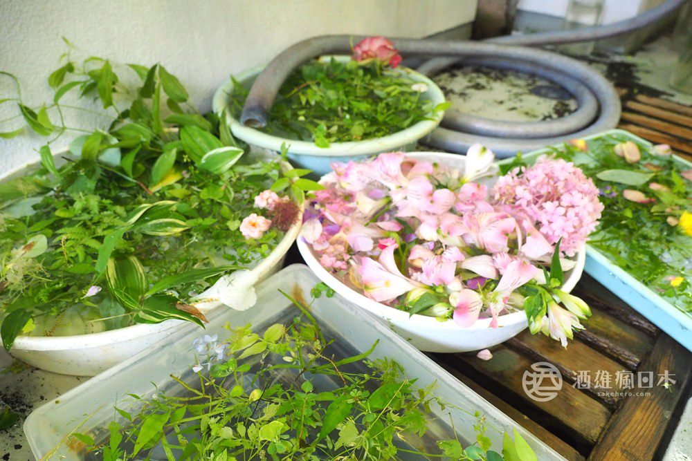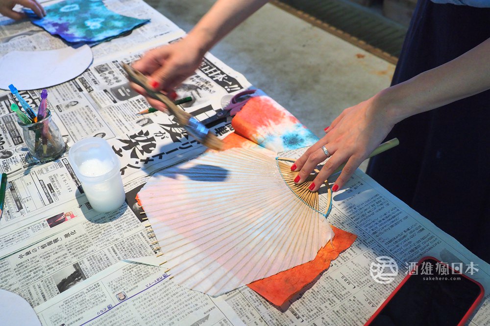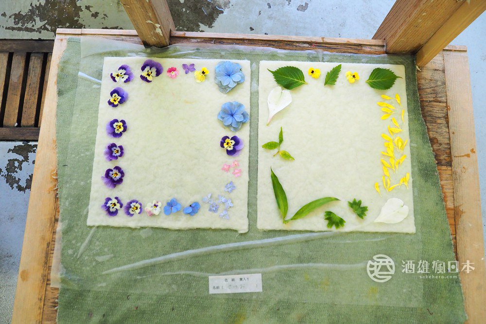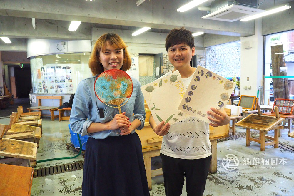 和紙製作本身非常簡單,只要可以聽懂簡單的指令(聽不懂也可以看老師的動作),就能很快速的完成和紙。因為我選擇的是有押花的版本,所以老師會給你剪刀跟鑷子,可以自由選用教室內與庭院的花來製作。另外,跟我一起去的旅伴則是選擇製作團扇。