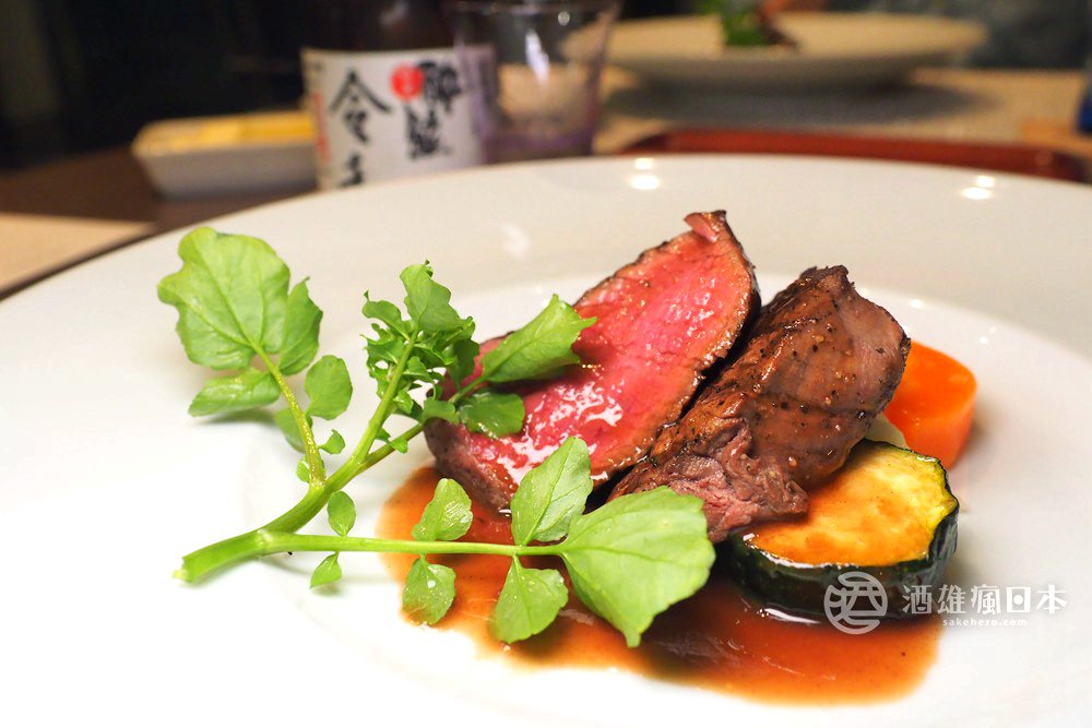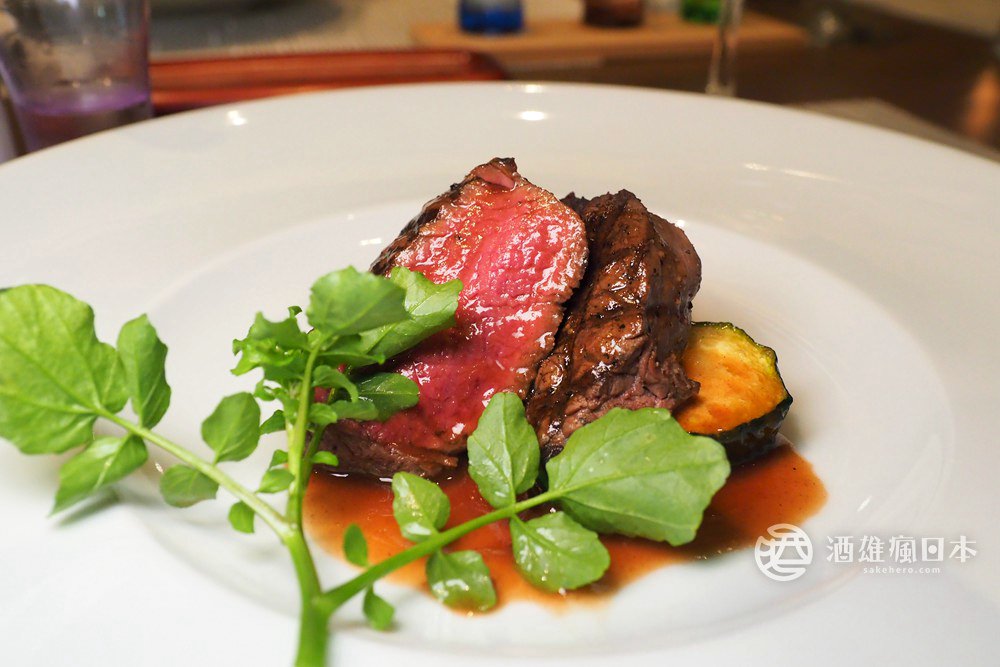 ▲搭配肉品的則是在地的醉鯨純米吟釀 旨味豐富俐落,確實很搭牛肉