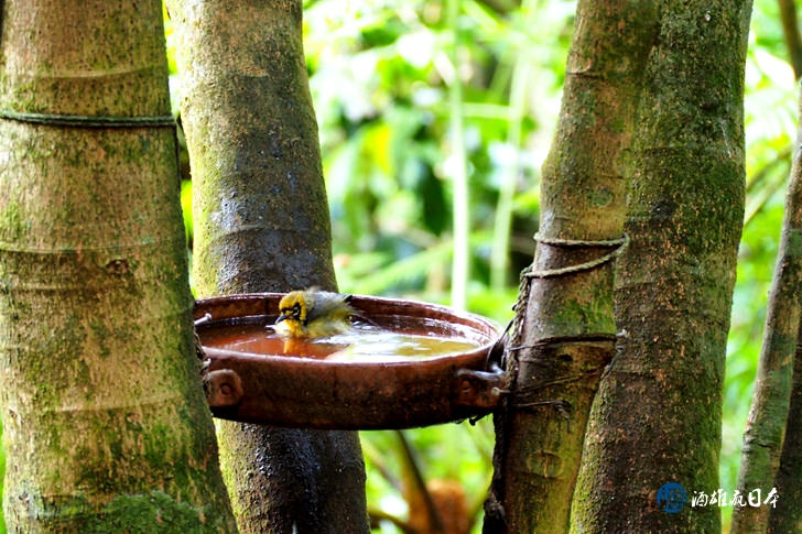 原來剛剛的水瓶,是要用來倒入盆子中,給小鳥喝水、玩水用的。母島這邊不太常下雨,所以山上常常沒有積水的地方,小鳥們就沒有水可以喝,所以就這樣登山的人,會用這樣的方式來跟小鳥互動。且很可愛的是,小鳥聽到倒水的聲音,就會主動飛過來,發出可愛的叫聲,真的有種寵物的感覺。倒完水之後,記得要稍稍退開,這樣小鳥才會飛下來玩水,畢竟你洗澡的時候,也不希望附近有別人在吧。他們會一隻接一隻飛下來,好像有在排隊的樣子呢!