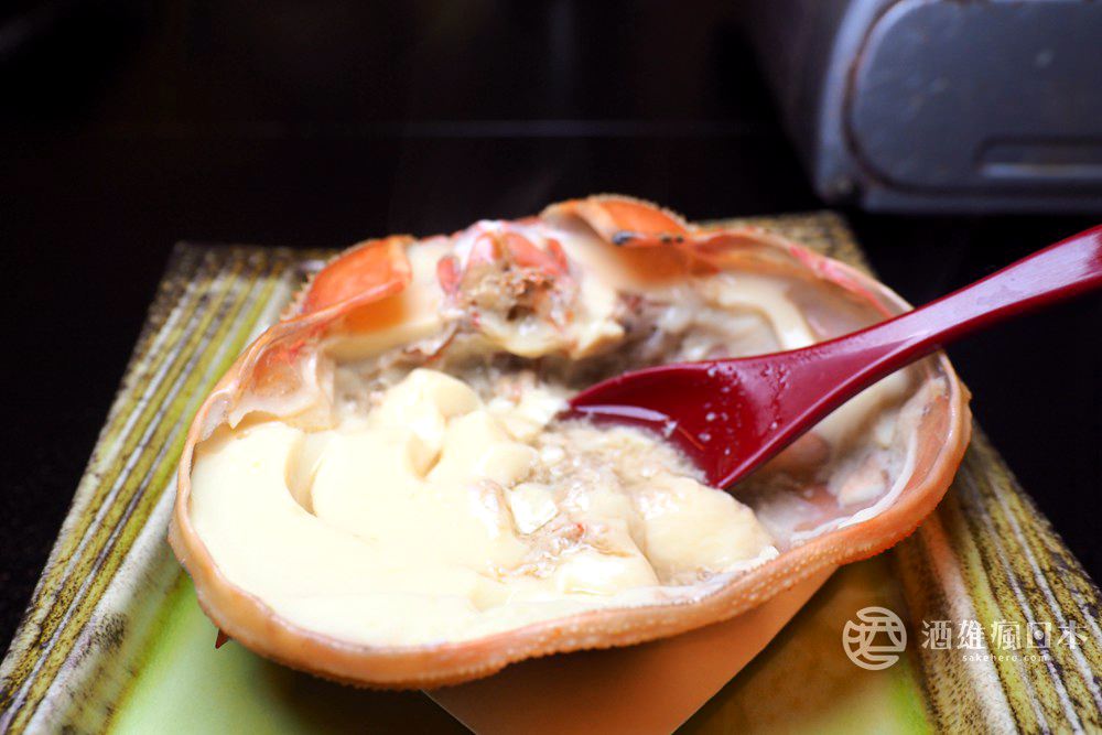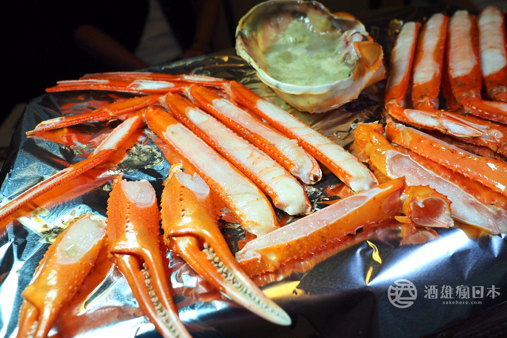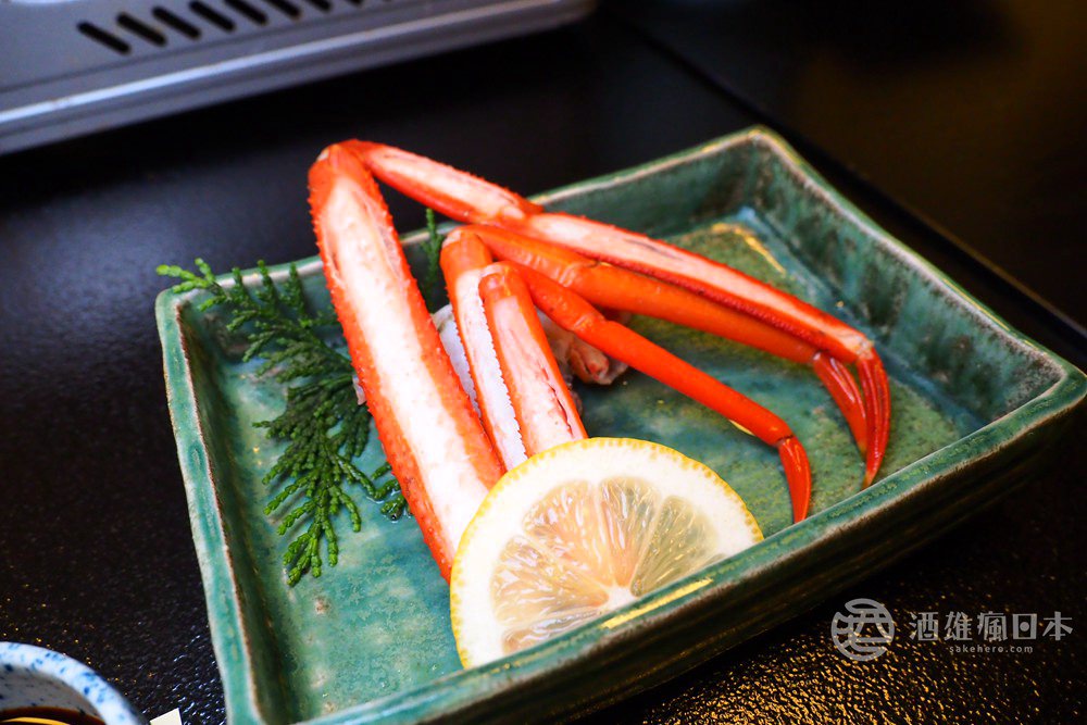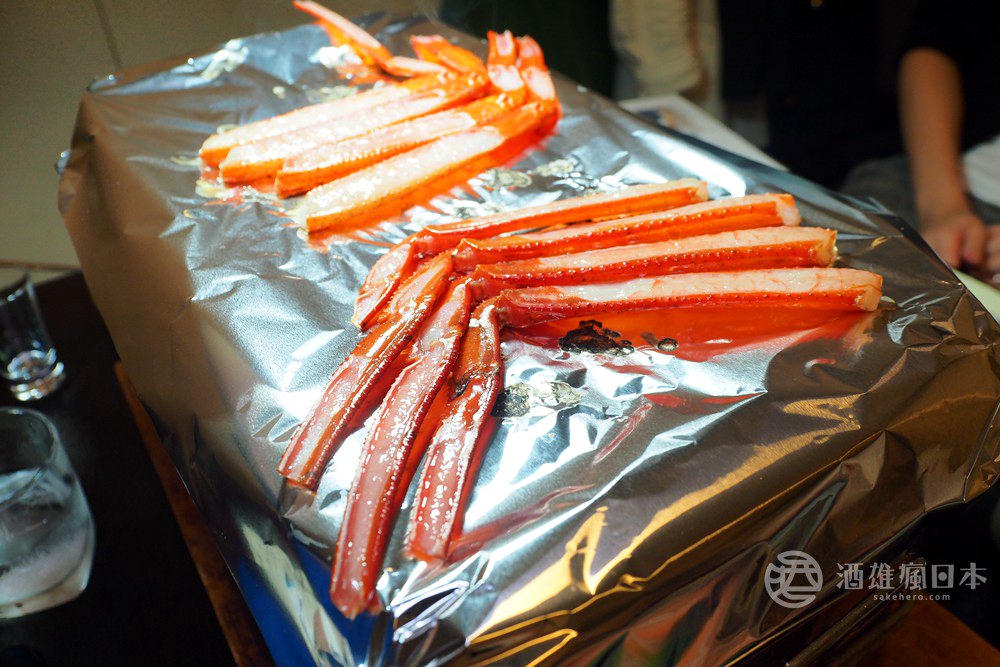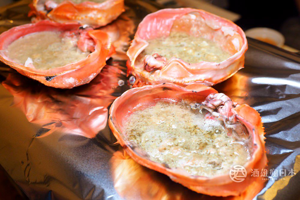隨我們點的螃蟹數量,一開始會先拿到餐桌上供人拍照,拍好就會拿下去處理。桌上會擺設一個炭爐,一個鍋。點好飲料之後,就會開始上菜。套餐會先上前菜、生魚片、一組蟹腳以及蟹肉茶碗蒸,讓我們可以先墊墊胃。然後來個烤蟹膏,烘烤之後的迷人香氣,足以讓人忘記所有的飲食限制。