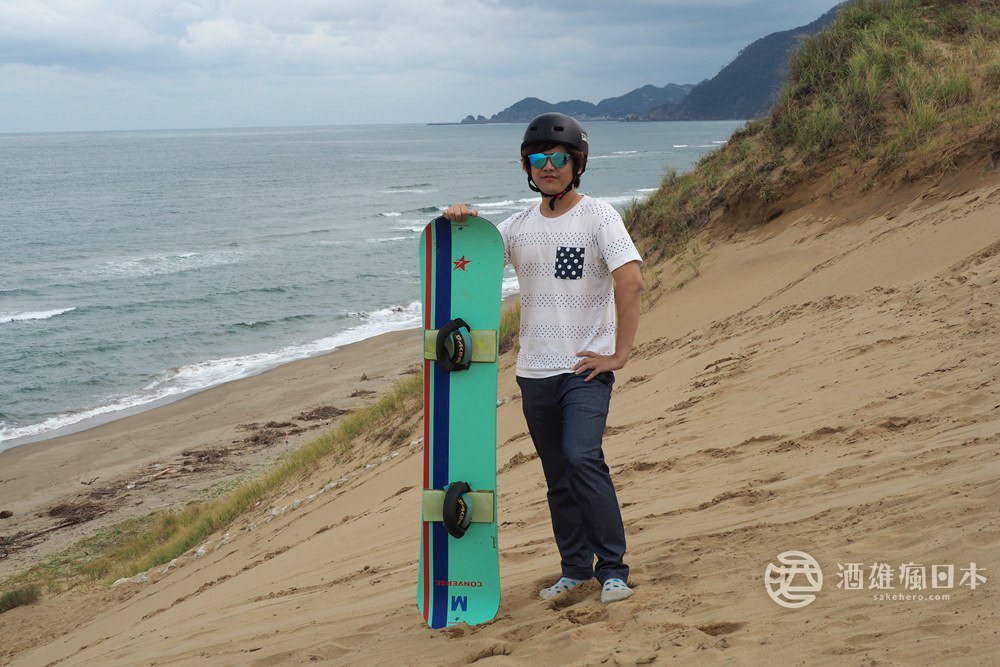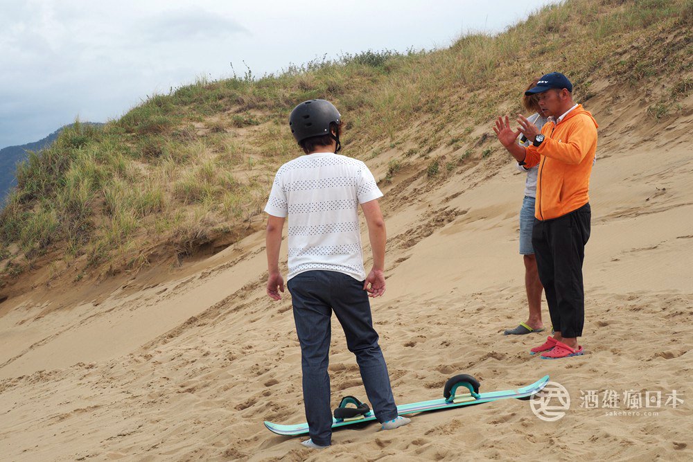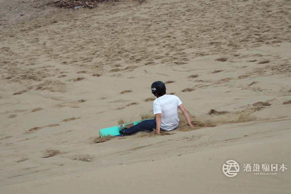 一大早我們就抵達鳥取砂丘,準備來進行今天半天的砂丘體驗。第一項體驗的是近來人氣急上昇的「沙板(サンドボード)」。在地上玩的叫「滑板」,在雪地玩的叫「雪板」,而在 沙地玩的就叫做「沙板」囉。因為沒有輪子,是利用坡道滑下去的玩法,跟雪板會比較相似一點,不過最大的不同,就是因為雪板摩擦力比較小,速度容易過快,所以滑的時候會走S型,而沙板無法如此,所以就是直直往下衝而已。