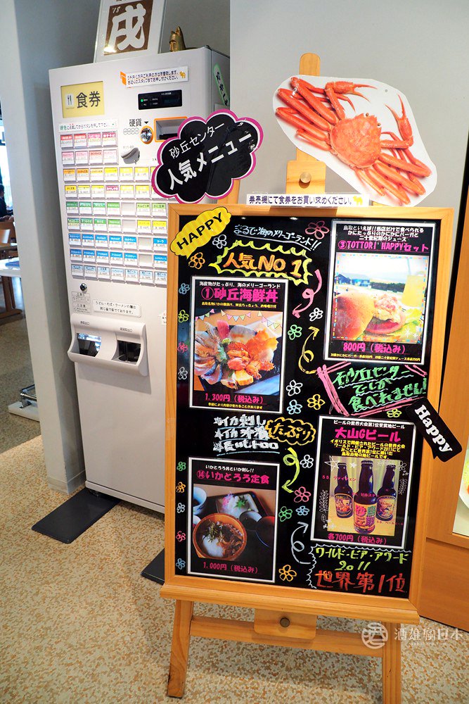 之後我們就到砂丘センター見晴らしの丘用午餐。這裡是一個大型綜合設施,結合了餐廳、團體餐廳、土產賣店與休息站的功能,如果你不知道去哪邊吃飯,或想買點在地土產,這裡都是一個選擇。午餐建議可以來份砂丘海鮮丼(1300日幣),若不吃生魚的也可以來份螃蟹漢堡(800日幣)。