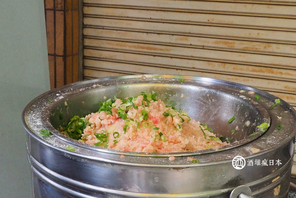 麵皮是每天早上現桿的,然後內餡是兩天前處理好放入冷凍,然後要賣之前才包。眼前這一桶就是老闆今天的扣打,因為本來是凍的狀態,利用常溫慢慢退冰,才可以用湯匙挖起來包湯包。我問老闆,會不會賣太快,來不及解凍呢?老闆笑說,也是有這種事情啦!