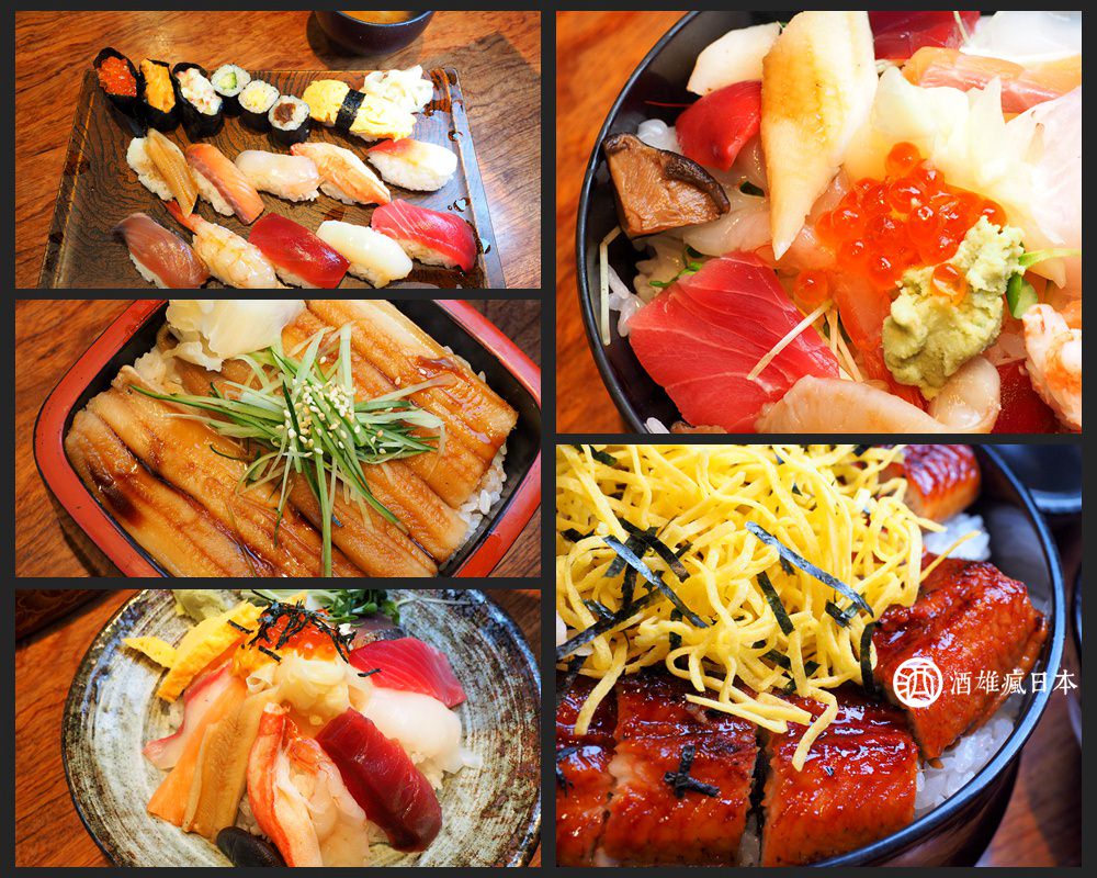 壽司14貫1000円(左上)星鰻丼1000円(左中)海鮮散壽司1000円(左下)散壽司丼800円(右上)鰻魚丼1000円(右下)