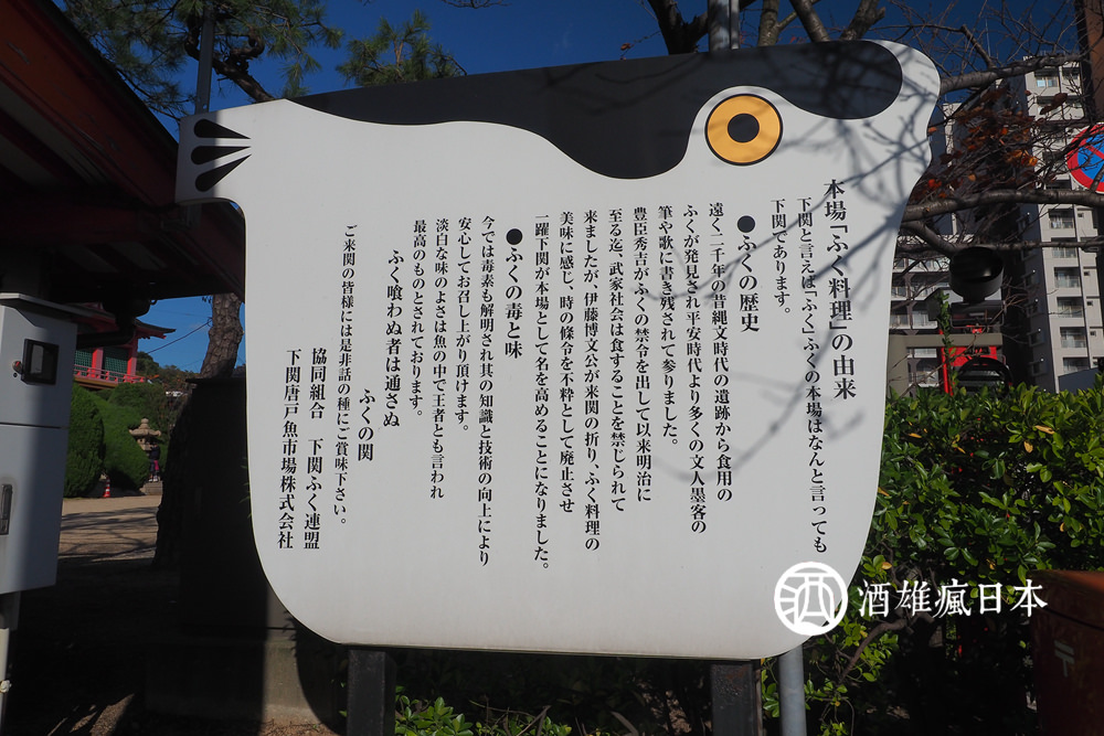 河豚食用的歷史,就寫在赤間神宮的鳥居旁,回溯自2千年前即有河豚食用的痕跡,平安時代更是文人的珍饈。後來豐臣秀吉禁止河豚食用之後,一直到明治時代都只能偷偷享用。直到伊藤博文有天來下關時,意外吃到河豚美味,認為這種美食不該被禁,遂開放了河豚飲食,一下子打響了下關河豚料理的名聲。