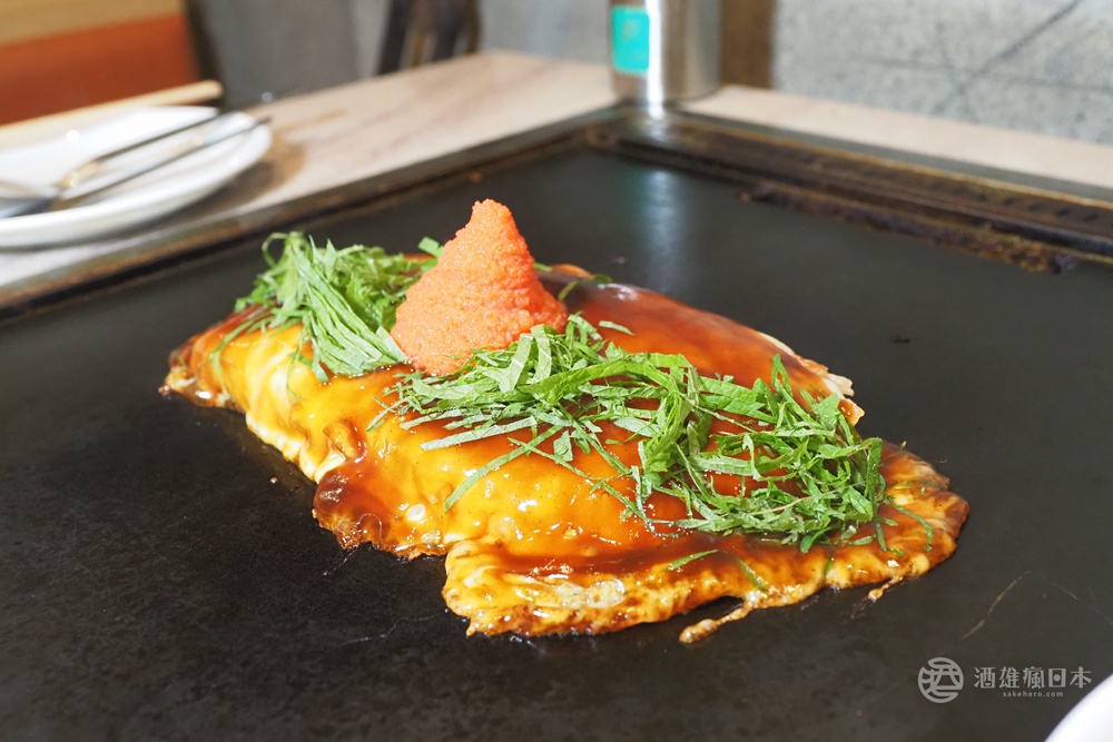 想來點日本風格的口味,所以點了明太子口味,沒想到除了明太子給的很大方之外,還加了切絲的紫蘇(大葉),吃起來很有層次,且因為他們把大阪燒做成橢圓形長條狀,更容易分切,也很方便吃,設想十分周到。
