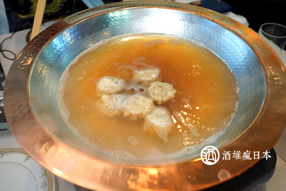 光是名稱就覺得霸氣十足,且帆立貝涮涮鍋還真沒聽過,是未知的領域。全部的干貝都是採用可生食的等級,就算不涮也可以直接入口。當然先來吃個生的嚐嚐,真的甜到不像話啊!然後第二顆我涮了兩秒左右再吃,高湯鮮味適度進到干貝肉裡,跟剛剛截然不同的美味。然後再搭配干貝的是特製醬油,沾一點點就能把甜味再更提昇,這涮涮鍋真是太好吃了!主廚來說干貝的好處就是不佔肚子空間,吃再多也沒有負擔。