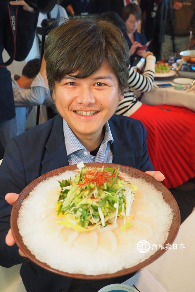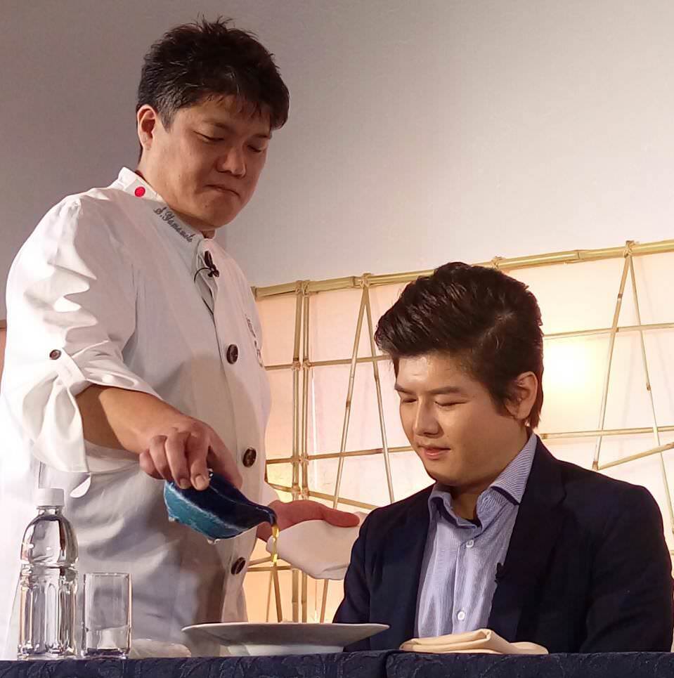 馬上就介紹了山本主廚登場,山本主廚分享東北是個得天獨厚的地方,在日本當中,其食材的豐富程度也是屬一屬二的,這次料理採用了三縣的食材「青森干貝」「岩手牛」「秋田比內雞」,無一不是上上之選,而且食材本身的個性很強,且都已經是完成度很高,幾乎是只要享受食材原味就能滿足,但這次因為有難得機會,就用自己的方式,呈現三種食材的美味,也希望大家可以品嚐看看!