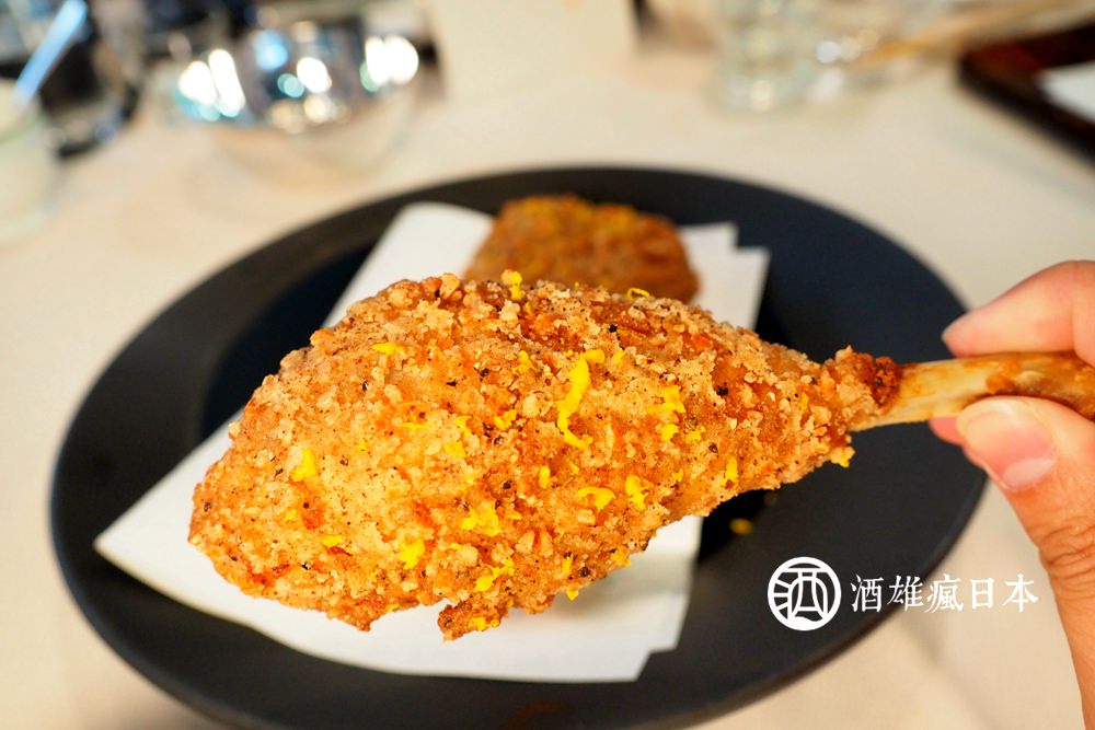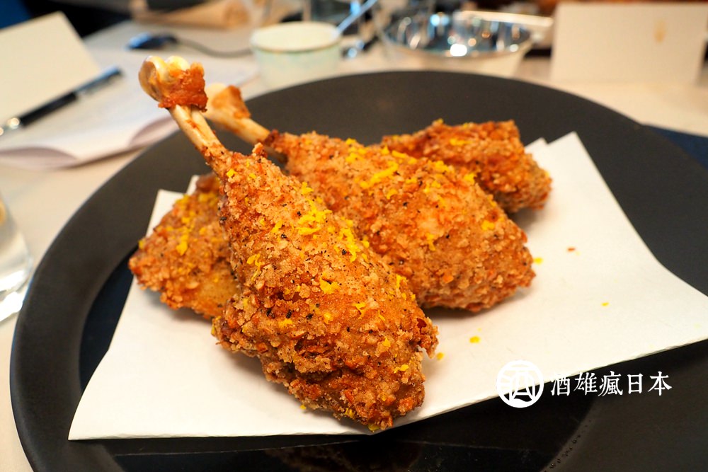 對於秋田的頂級食材「比內地雞」,決定做成炸雞,這完全跌破大家眼鏡,那是因為比內地雞比較有嚼勁,一般來說做成燉煮的料理會比較多。雞腿處理好之後,都有先用85度的雞油,泡上70分鐘讓他幾乎都熟了,才進行炸的步驟。