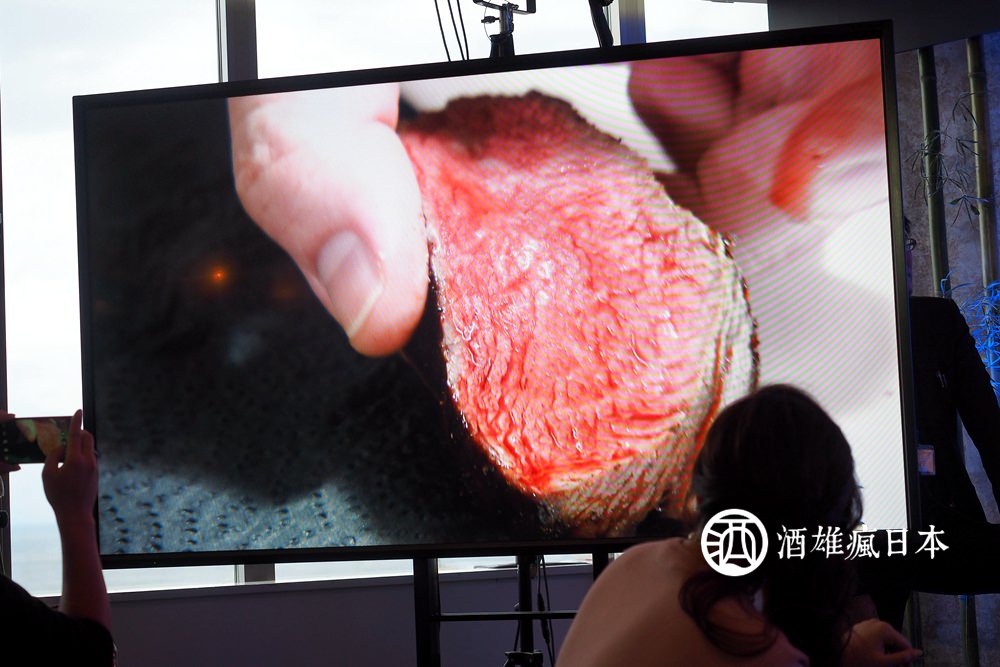 之後把牛肉切開,顏色雖然鮮紅,有些人恐怖疑慮是不是血水,但主廚把上用手捏那塊肉,首先那彈力十足的感覺,已經讓現場的人都融化,然後透明的肉汁緩緩從肉塊流出,主廚說其實顏色雖紅,但已經沒有血水,會流出來的,只有美味而已!