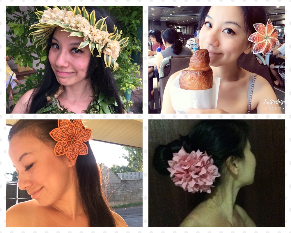 大溪地女人每天都會在頭上配戴花飾,無論是單朵扶桑花、雞蛋花、Tiare或是華麗的手作花圈,都更能凸顯女人的美與撫媚,這也是我深愛花飾的原因之一。在大溪地的日子,我也是天天佩戴造型不一的花飾,一起跳舞的朋友們亦是如此,這讓我每天都有好心情!