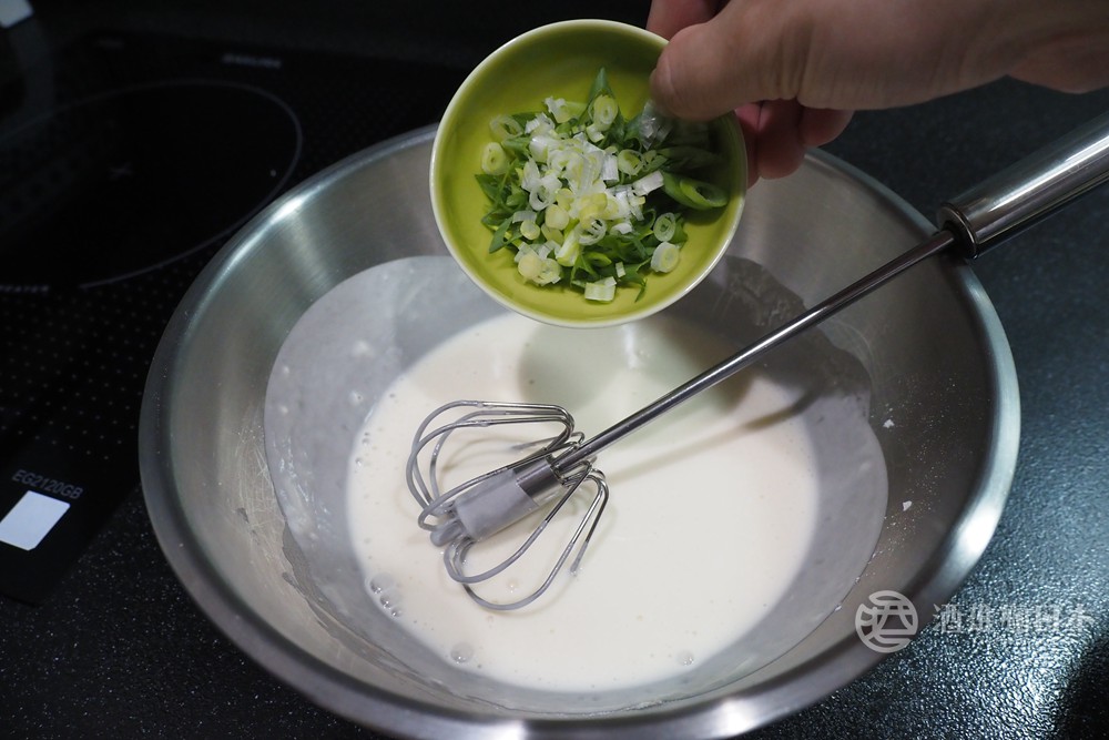 將粉類加入調理缽中,以打蛋器打到沒有結塊。加入蔥絲及九層塔碎之後,攪拌均勻,粉漿就完成了。