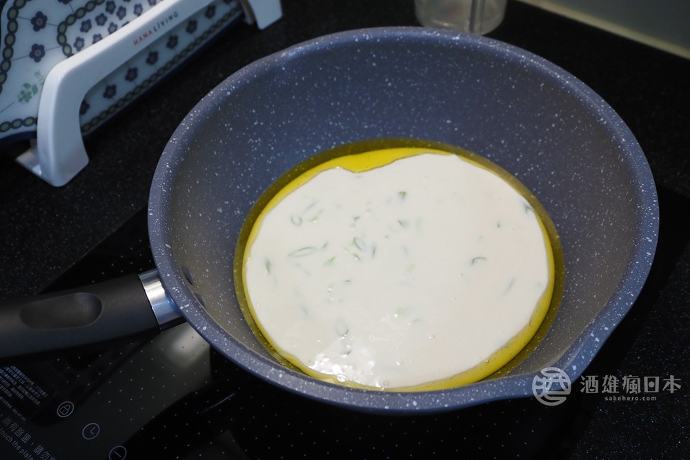 冷鍋冷油加入粉漿,開中火,煎到餅皮上色之後,翻面之後繼續煎。這時可以加入蛋液,如果蛋液太多可能溢出餅皮面積,也沒有關係。蛋差不多成形,可以加入想加的配料。如果配料是比較不容易熟的(如里肌肉片),會建議在煎餅皮之前先把配料煎熟。