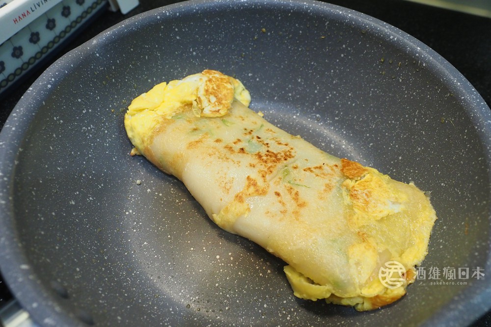 加入配料之後可以把蛋餅折成三折,然後表面煎到自己喜歡的酥度,就可以起鍋了。