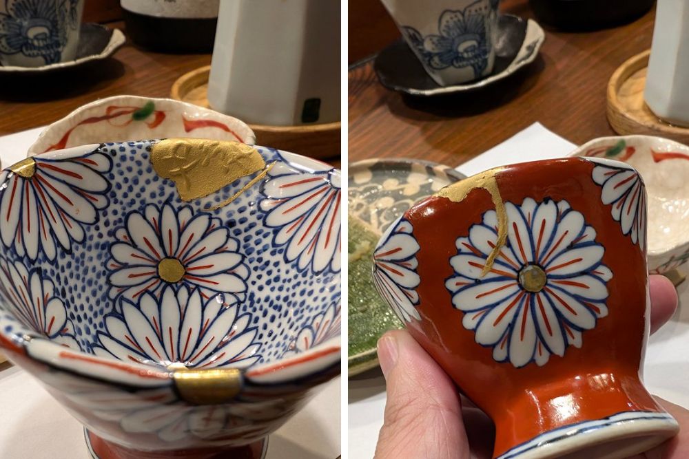 ▲使用金繼填補起來的美濃燒的酒杯,用這個跟老闆娘乾杯,特別好喝(而且還是老闆娘請的酒)