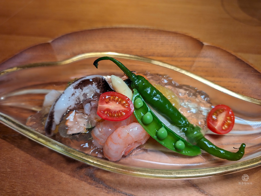 六条河原院 讃的遠藤料理長,之前是在金澤 紋(現在變成完全預約制)當料理長,後來隨著本店開幕,就來這邊掌管大小事。餐廳屬於「サロン・ド慎太郎」集團,是一個從京都到銀座,從藝妓的夜晚世界,到陶藝品藝廊、餐飲跟酒吧,涉獵非常廣泛的創業家,所創建的其中一個餐廳。學妹H在京都一直從事跟旅宿、短租、長租等,跟外來移動人口息息相關的產業,說實在他跟這樣的餐飲集團有所連結,其實也不是很意外。