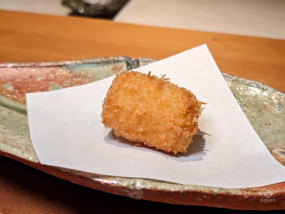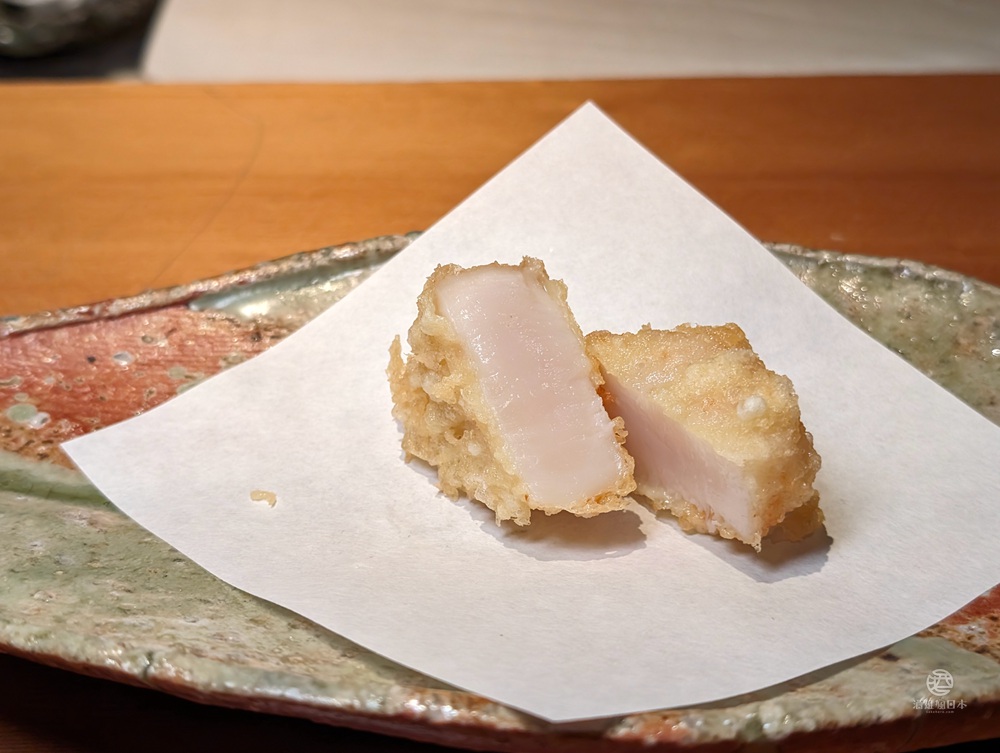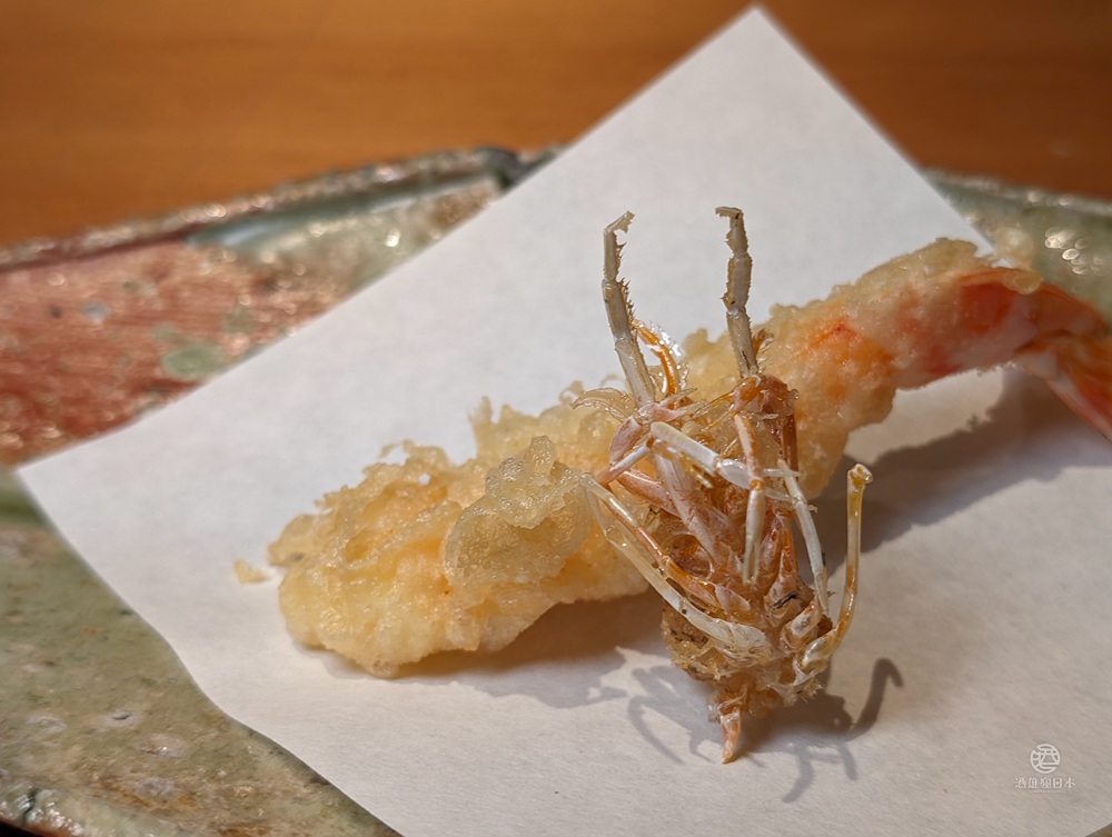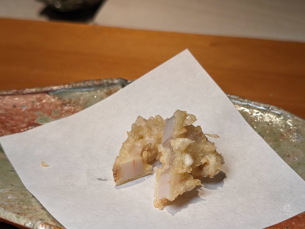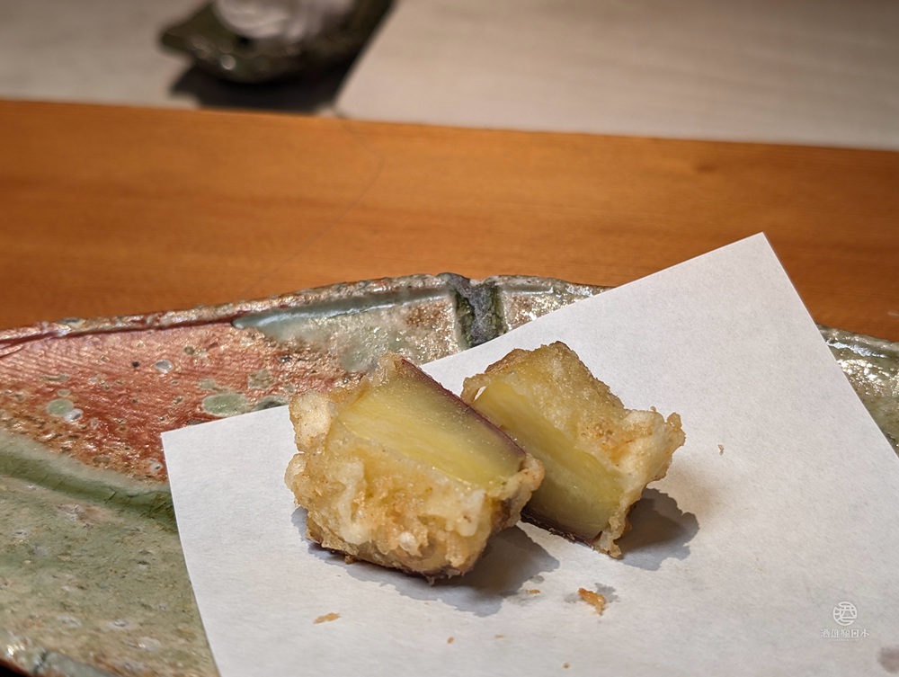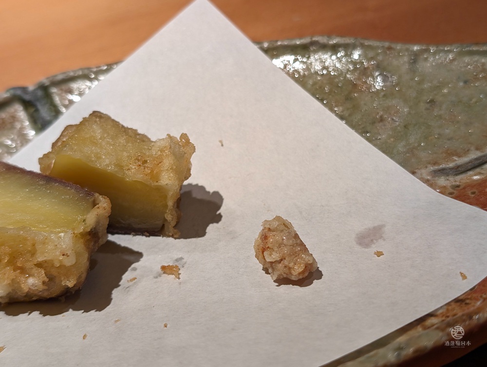 地瓜旁邊的小小天婦羅,是第一道明蝦的蝦膏,料理長還特別取出,在下一次油鍋,鮮美極品,又是一個超級下酒菜。