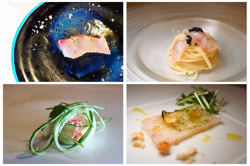 鯛魚用日本料理技法湯霜調理,讓魚肉充滿彈性,搭配上僅使用滿月夜採集的海水製作的店鹽「月の雫」跟一點橄欖油提味,完全引出白身魚的淡雅鮮味,第一道就感動了。有點類似カルパッチョ(卡爾帕喬)的吃法,讓人感受到西洋與日本的融合,開場白就抓住我的心,讓我佩服不已。