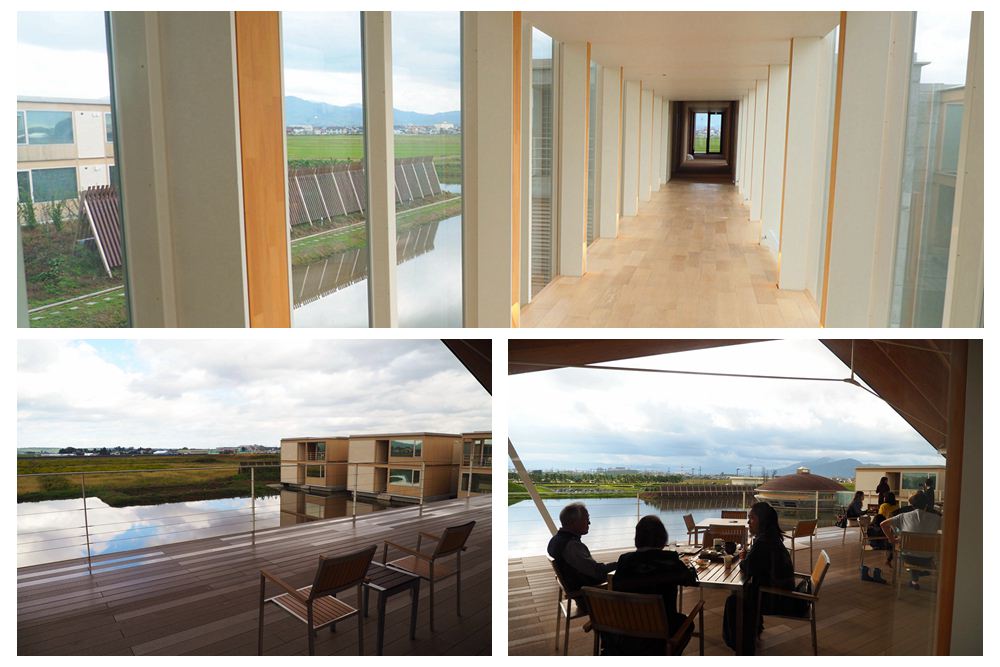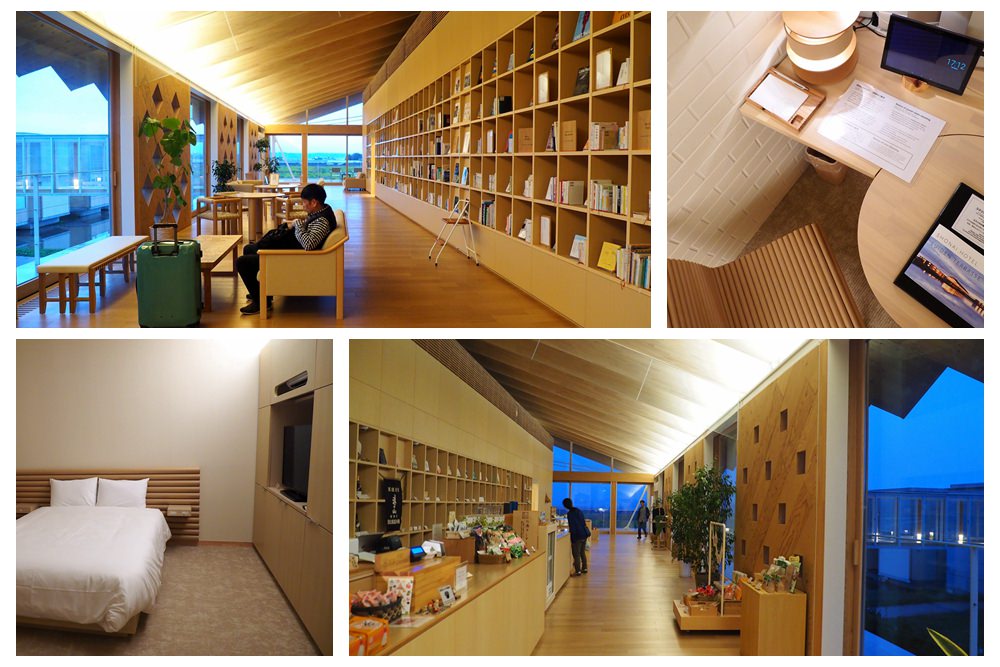 住宿區域位於與大廳以長廊相連的四個衛星棟,前往房間的路上,會經過好幾個轉角,方向感不好的人可能會迷路,所幸每個盡頭都有落地窗,朝窗外看去就好像在看一幅水田畫作一樣,因此就算迷路也是一種樂趣。