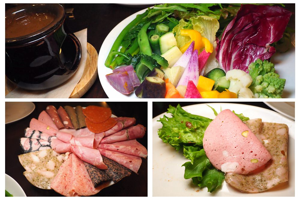 到了約定時間,我們走進店裡,才發現座無虛席,小小的空間擠了大約30個人。第一道上來的就是我超愛的熱水澡沙拉(バーニャカウダ),搭配20多種在地產的鮮蔬,除了根莖類,還有葉菜。用蔬菜去沾以鯷魚提味的沙拉醬,沙拉醬會用燭台不斷加熱,熱熱吃非常暖胃。