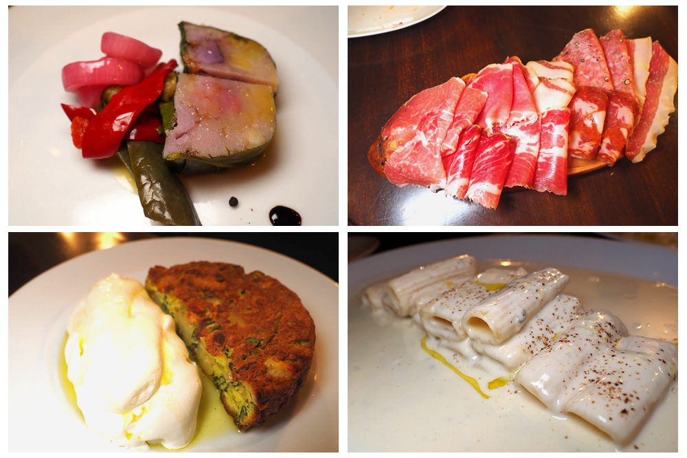 義大利風蔬菜烘蛋佐起司與奶油醬。烘蛋又油煎到表面堅硬,提供了一整晚還沒吃到的脆口感,單吃享受蔬菜跟蛋的原味也不錯,加點奶油跟起司,享受圓潤風味也不錯。本以為沒有了,竟然還有義大利麵作為飽足感來源,其實我們在這個時間點已經飽了,但四種起司的寬管麵一上桌的奶香,又讓我們屈服於食慾之海。