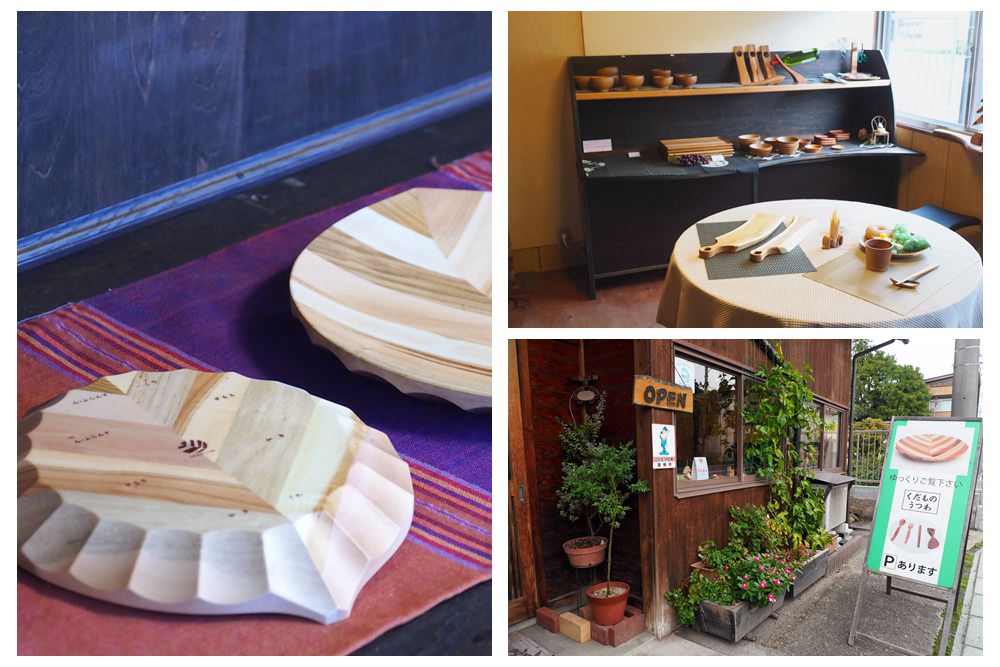 店名就叫做くだものうつわ(果物器皿),老闆曾是一個專做木頭拉門的職人,但因為現代人建築轉向西洋式,因而工作大減。後來他決定轉型做不一樣的木工,想到以水果聞名的山形,就以果樹來製作,反而因此受到矚目。現在跟兒子媳婦兩代一起製作、經營。他拼接不同色調與紋路的木材,組成一個器皿,樸實還有帶些時尚感,個人非常喜愛。去年有買些作品回家使用,至今仍為我家餐桌,增添許多氣質,大家若有興趣不妨跑一趟看看哦!