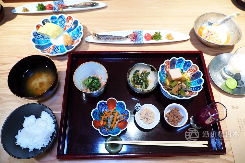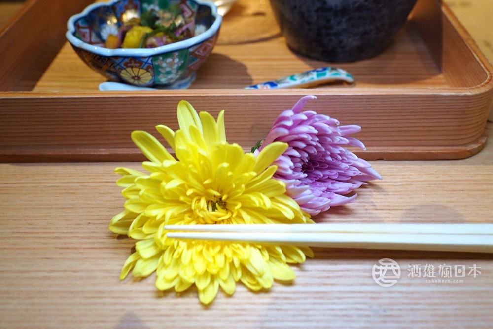 瀧波的餐廳叫做1/365,是以飯店所在的置賜地方產蔬菜為主軸設計餐點,飯店本身也有種植米、蔬菜,也跟在地的有機農家配合,就連整套餐最後的白飯,都強調是有機栽種白米,非常有自己的主張。看了一下菜單,「霜降之刻」「山・里・海」「大地之香」每道菜連名字都取得很有詩意,而且筷架還是用在地產菊花來做的,光是坐上這個餐桌,就覺得自己氣質高雅了不少。