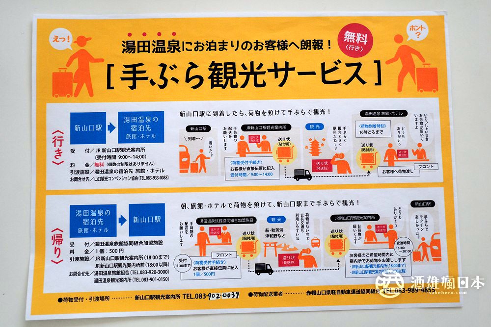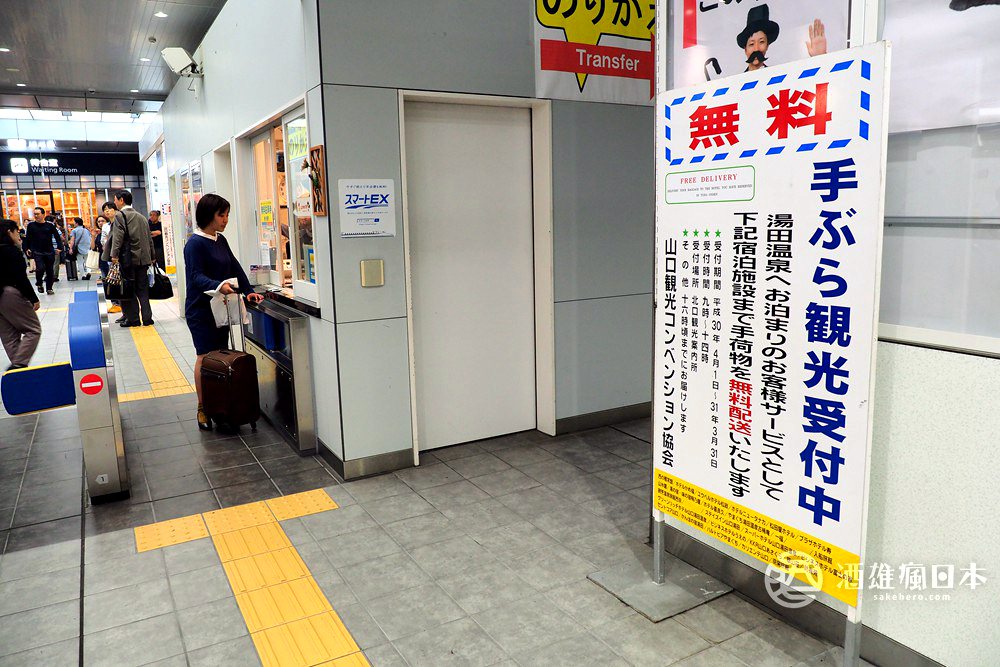 從新幹線的車站「新山口站」一出來,就可以看到空手玩山口的告示牌,只要晚上入住湯田溫泉的飯店,就可以使用這個服務。拿到服務櫃台寄放,他們就會幫你送到飯店,可以說是非常方便,而且最好的是「完全免費」!湯田溫泉是山口市最大的溫泉區&觀光地,美食也不錯,晚上選擇住這邊是不錯的選擇哦!