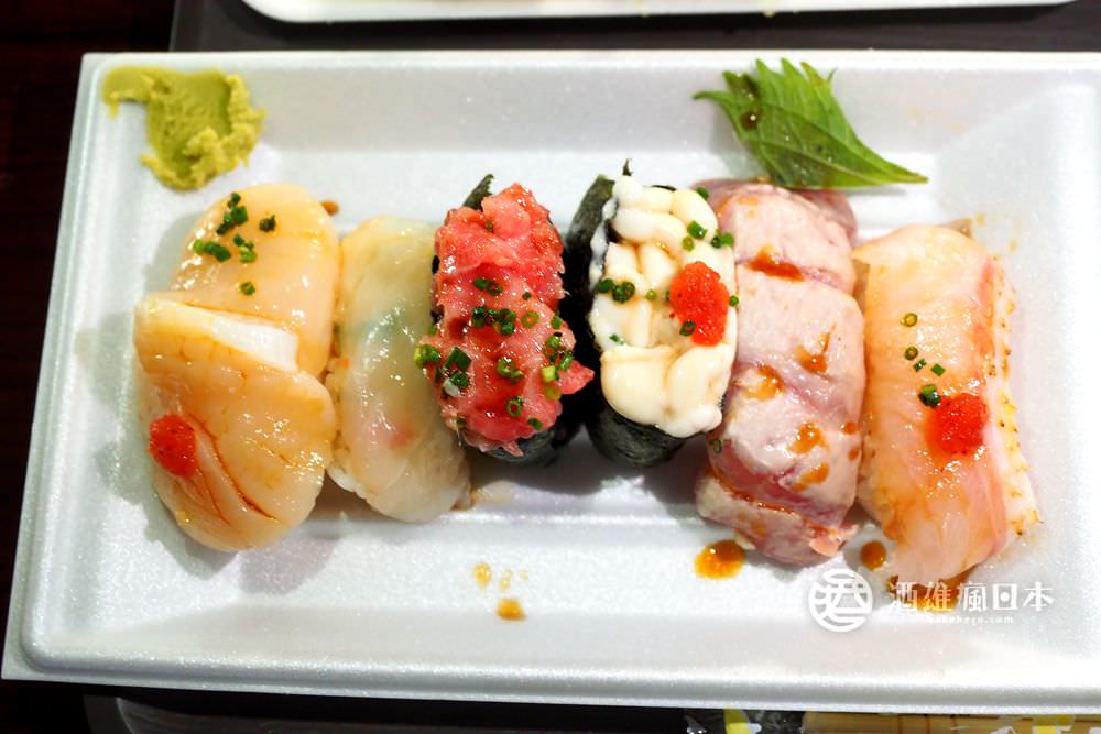 這樣大概是1600日幣,左至右依序是干貝、河豚、蔥鮪魚、河豚白子、鮪魚中段、炙燒鮭魚肚。唐戶市場平常是做魚貨的批發,假日才有開放一般客人來逛攤位,樂趣就是在於可以從琳瑯滿目的壽司中,挑選自己喜歡的來吃!口味上還OK,小吃一點感受一下!