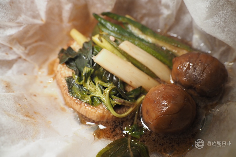 以紙包烘烤的方式呈現,但裡面不是加滿香料的義式風格,而是三杯口味的十足台味。蔬食烘烤得宜,醬汁入味,時尚而美味。